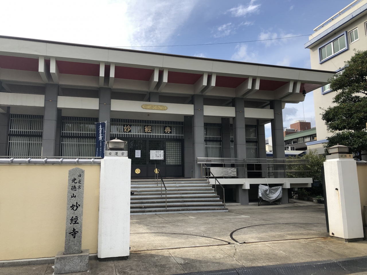 谷町筋沿いにある妙經寺。地下鉄谷町線「谷町9丁目駅」と「谷町6丁目駅」のちょうど真ん中くらいのところにあります。谷町筋から一本西の通りにも寺院がたくさんあり、どの寺院も木造の落ち着いた雰囲気ですが、谷町筋沿いの寺院はどこも近代的な建物が多い。ここ妙經寺も立派な会館といった感じの寺院。特に見どころはありませんでした。
