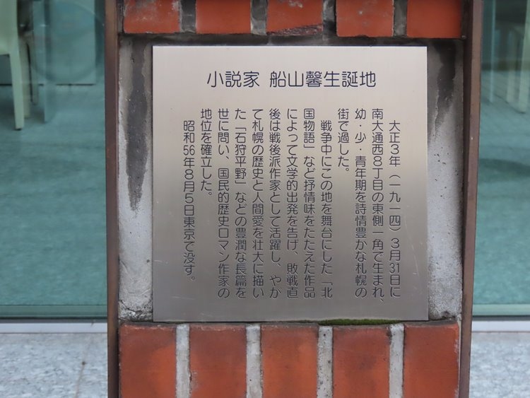 大通西8丁目、大通り公園のすぐ南のブロックにあります。けっこうそれだけでは位置がわかりにくく、第一三共の建物を目印に東側を見ていき、やっと見つけました。説明板には「氏は大正3年(1914年)南大通8丁目の東側一角で生まれた」とあり、正確な位置を再現したようです。戦後すぐ札幌の歴史と人間愛を壮大に描いた作品で、国民的歴史ロマン作家として知られたと書かれていました。地域の人々の生活を描くことがこうして観光的なメモリアルへと関連づけられているのも、いかにも「昭和は遠くなりにけり」なのだなあと思いました。