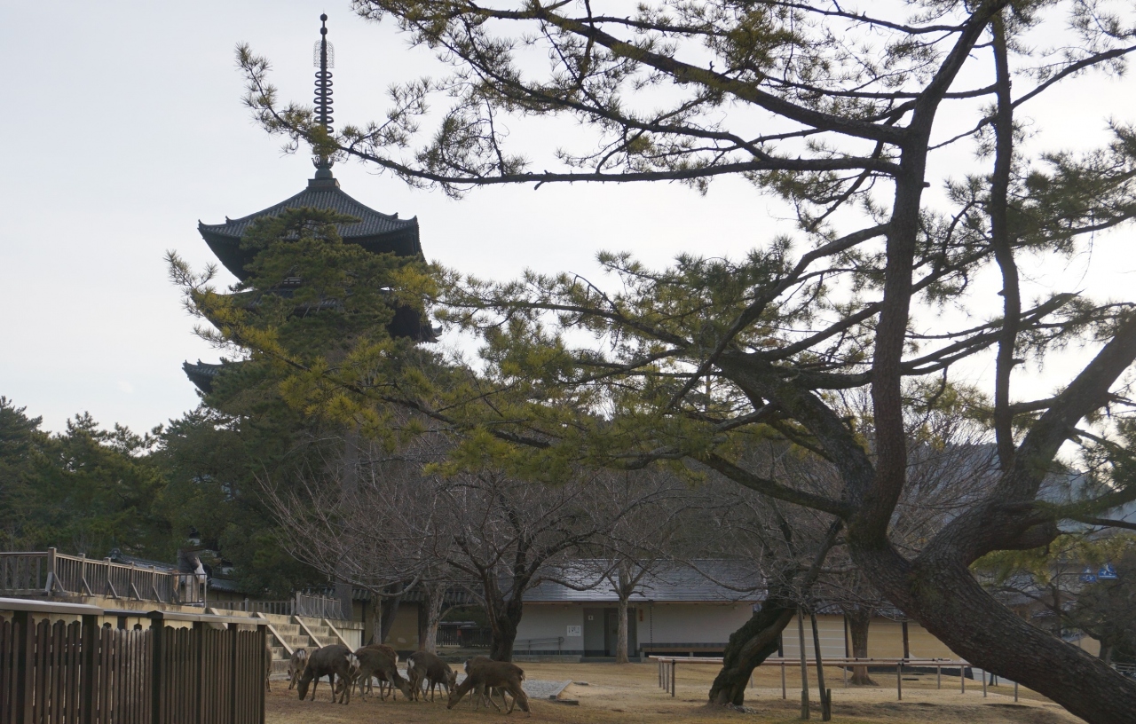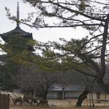 朝の7時半頃、近鉄奈良駅から徒歩で行きました。五重塔近くに鹿がたくさんおり、エサを食べた鹿は奈良公園の方に向かって行きました。五重塔は工事中ではありましたが、国宝だけあり塔は高く見ごたえがありました。