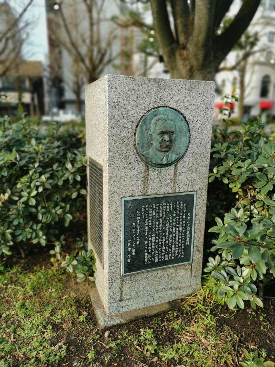 大桟橋駐車場に車を停めて早朝の横浜港を自転車で散策しました。大さん橋ふ頭ビルから山下公園へ。山下公園はミナト横浜を代表する公園です。色々なテレビでも有名。公園は横浜港に面して横長。氷川丸など港風情が満喫できます。「リカルテ将軍記念碑」は石のステージ近くのおまつり広場に面した植え込みにひっそりとあります。フィリピン独立に尽力された方との事です。