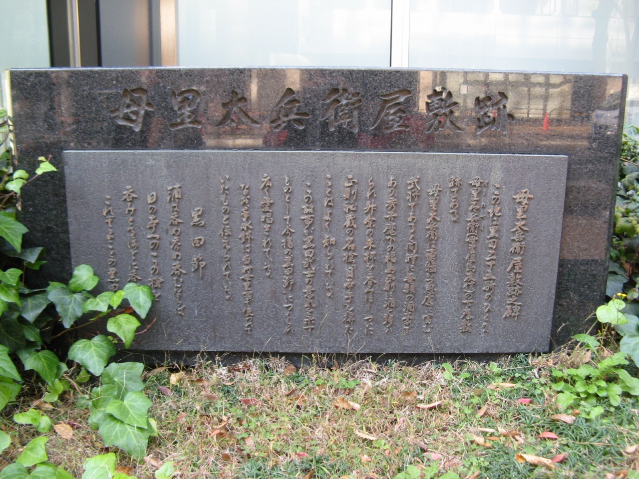 黒田節の主人公母里太兵衛の屋敷跡です。天神の明治通り沿い、野村証券ビルの植え込みに石碑がありますが、この辺りは今は繁華街とビジネスの中心街になっていて屋敷の面影はまったくありません。屋敷の長屋門は福岡城跡に移築されてますので観に行きました。