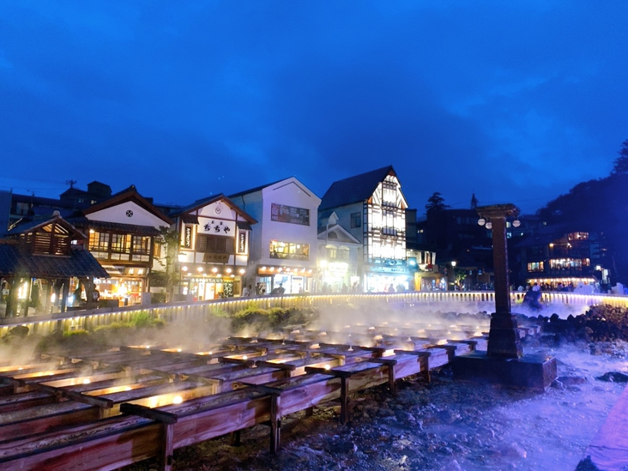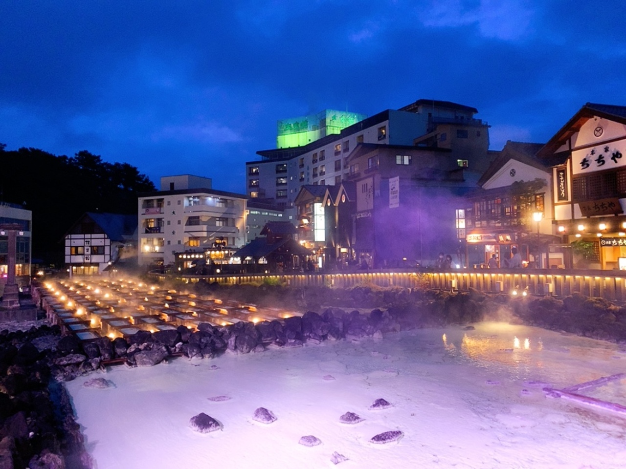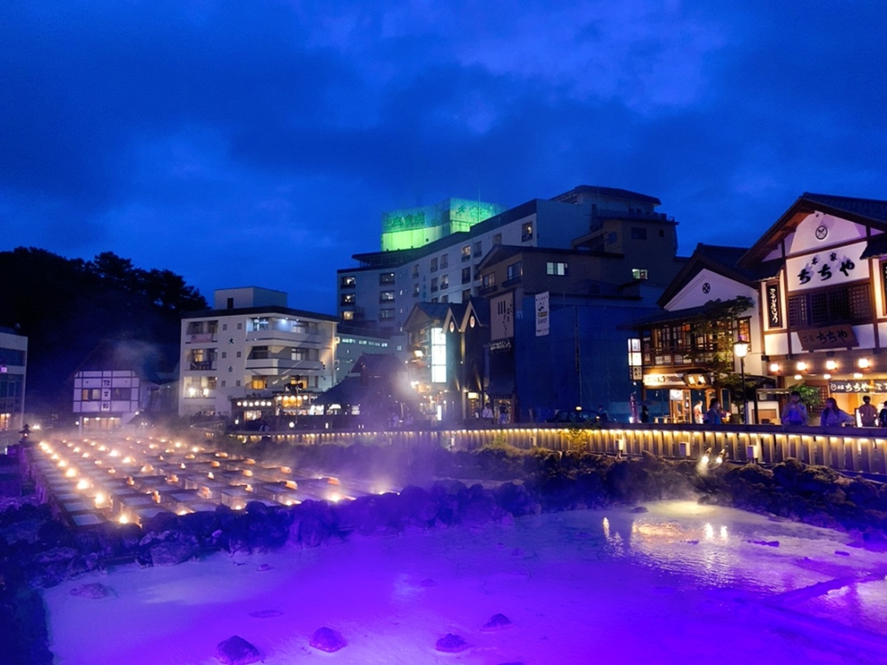 草津温泉の湯畑は結構規模が大きく、20-30秒ごとに色が変わる、湯畑のイルミネーションはなかなか幻想的でした。 昼間と夜ではライティングが違い、また違う魅力がありました!