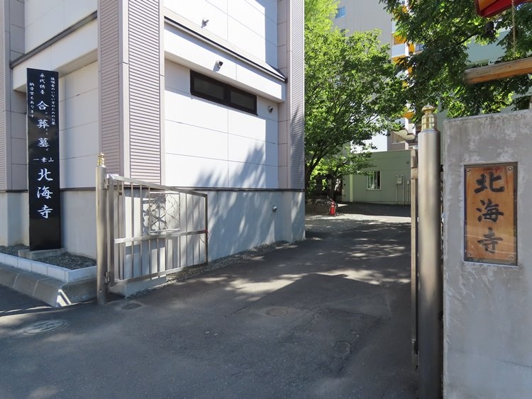 南三条東三丁目。創成川の上手、東側になりますが、寺院が多く並んでいるエリアから少し離れています。この地に堂宇が建立されたのは明治23年(1890年)だそうです。一条山という号は確認できましたが、宗派が明示されていないお寺でした。ちょうど敷地の角に朱塗りの鐘楼があり目立っていましたが、正門の向きと本堂が一直線ではなく、古そうな木造の本堂に対して納骨堂はコンクリート製で立派というアンバランスな印象を受けました。