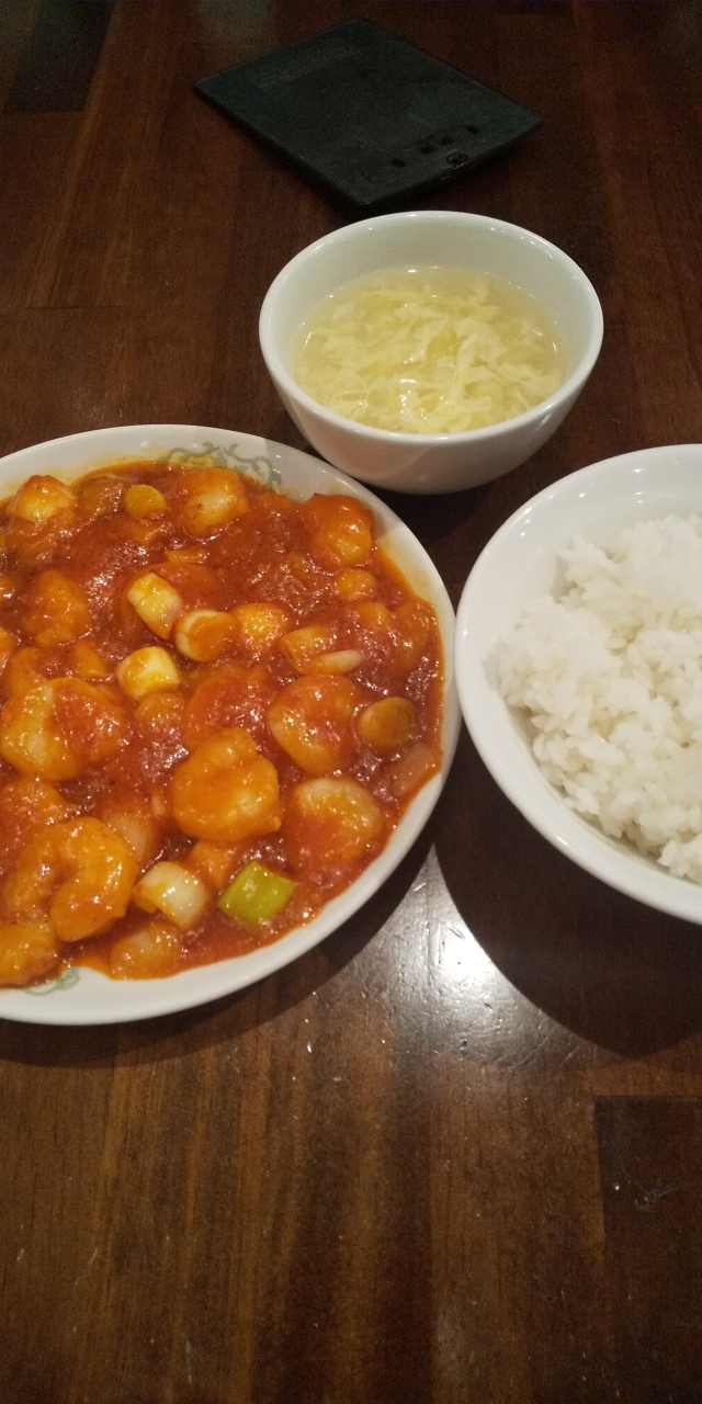 私はエビチリにしました。量は多くエビももちろんたっぷりなのですが、とてつもなくしょっぱかったです。ご飯も固めでした。たまたまなのかどれもしょっぱいのか。。