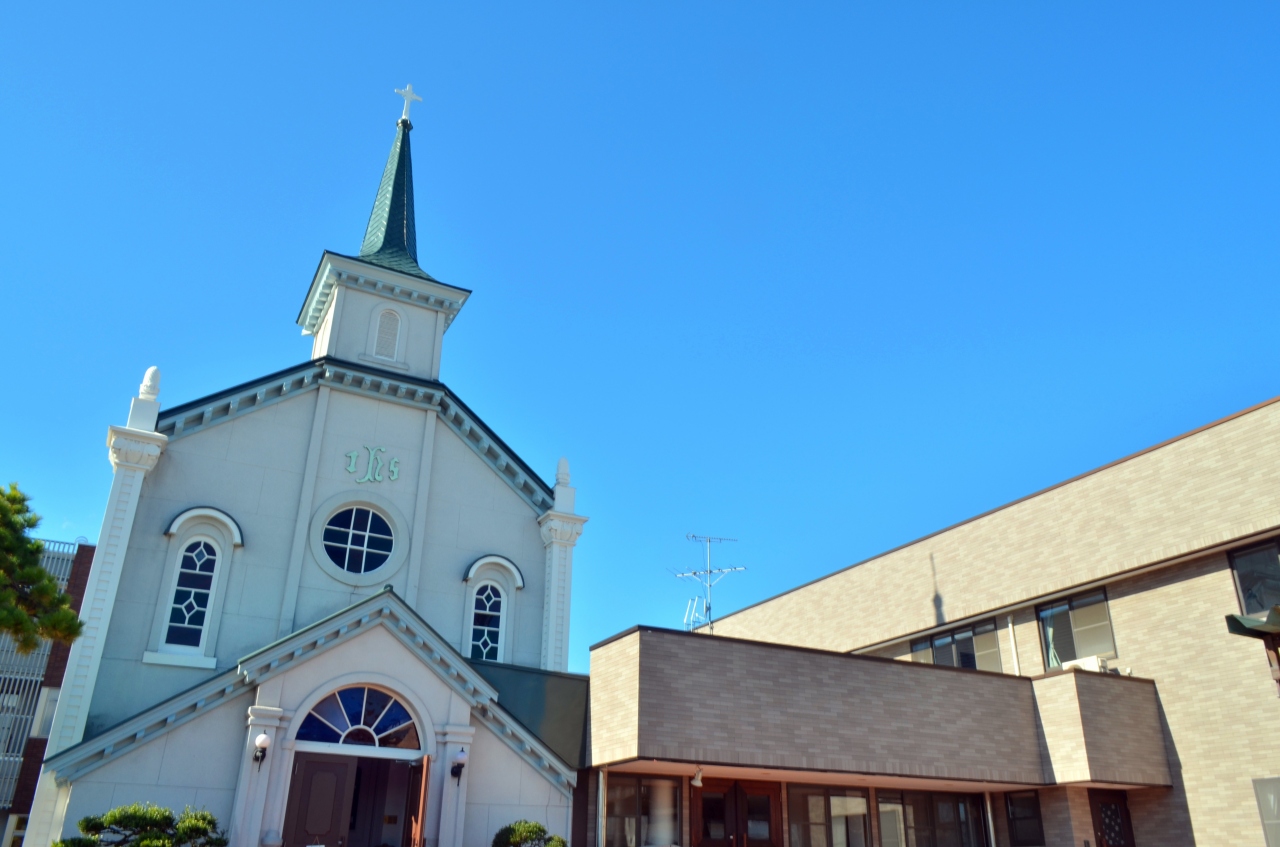 弘前へのカトリックの布教は明治11年頃から活発になり、現在の弘前カトリック教会堂は1910年にオージェ新婦の設計をもとに日本人が建設された教会だ。ゴシック様式的な尖塔やロマネスク様式の半円アーチなどが取り入れられた複合様式として作られている。