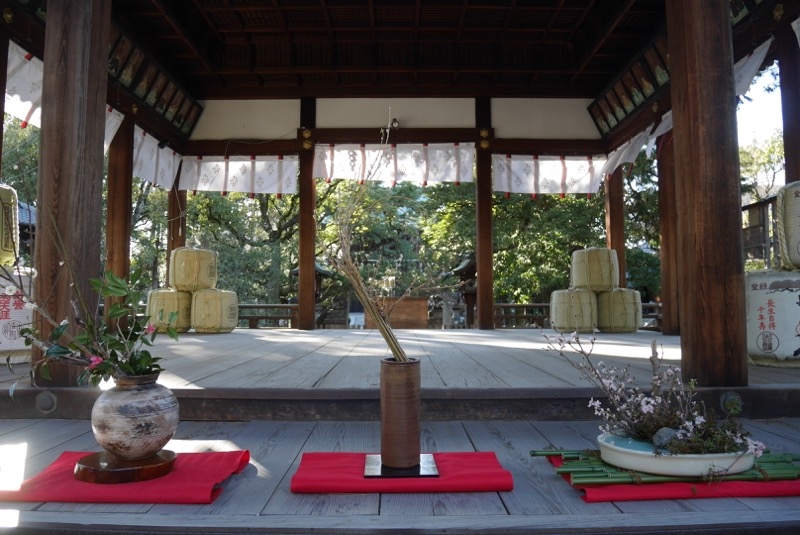 広々とした神社。神社のまわりには堀の跡があり、昔から重要な場所だったのだろうと思われます。広々しているわりにはだれか常駐しているわけではないのですが…なんと、敷地の中央あたりに生け花があるではありませんか!3人の人が、それぞれ京都をイメージしてつくりあげた作品。ふだん、生け花に触れる機会がないので興味深く見ることができ、いい経験になりました。