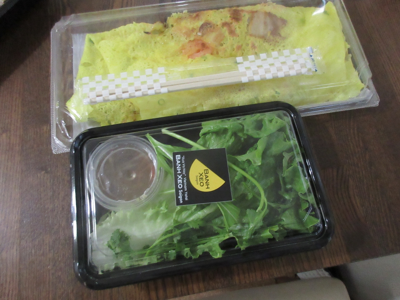 今回はテイクアウト利用、お店の名前にもなっている「海老豚肉バインセオ」1200円と「海老の揚げ春巻き」1320円にします。