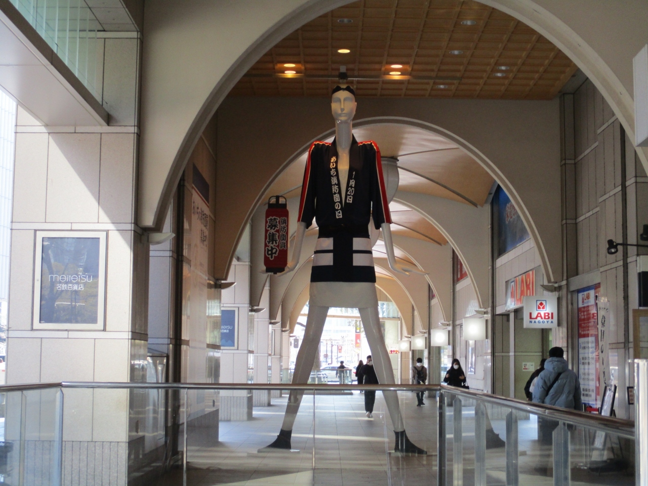 名鉄百貨店の入り口前にいるナナちゃん人形。場所がよくわからなくて、通りかかった方に聞いたらすぐに教えてくださり、たどりつけました。身長6メートルほどもある大きな人形です。時々衣装替えをしているようです。初めてだったので、衣装より大きさに圧倒されました。
