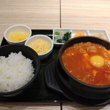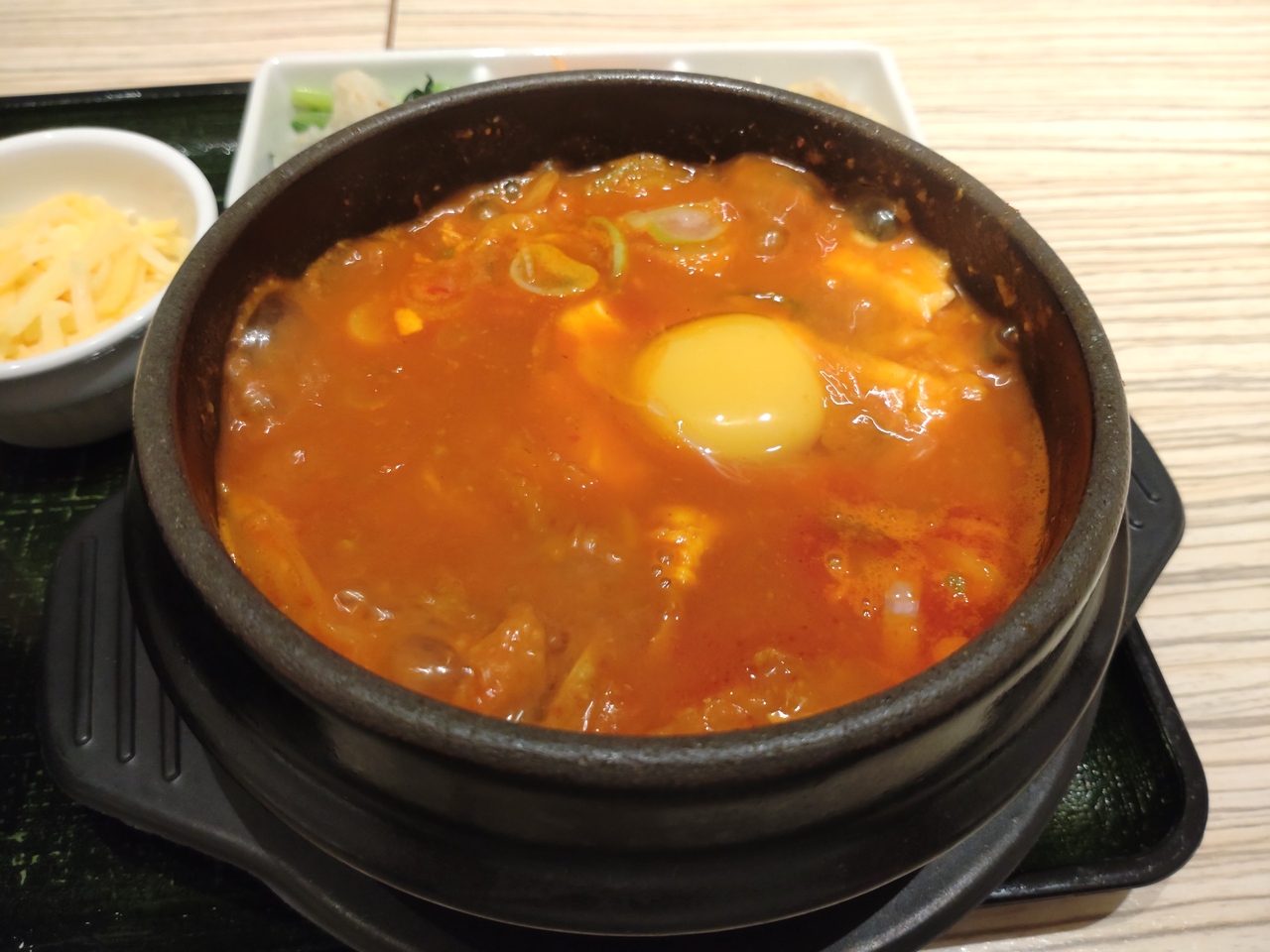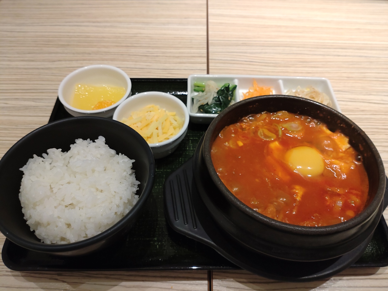 今回は、「豚キムチズンドゥブ」にチーズトッピング。辛さは少しホッとの3辛をオーダー。待つこと5分くらい、提供されたズンドゥブは真っ赤でグズグズ、少し目に染みるくらいの唐辛子の匂い。しかし、カプサイシンの効果なのか見ただけでも食欲か進む。店員さんに「よく混ぜて食べてください」と言われて、まぁ混ぜる。熱々ですが、辛さよりも旨味が先に。豆腐もフワフワでコクがある。チーズも辛さを飽和するのに良い。スプーンてご飯を入れながら食べるのがとても美味い。ランチだったのてごはん(サイズが選べる)とデザートかつく。韓国で食べたズンドゥブよりも美味しい気がした。