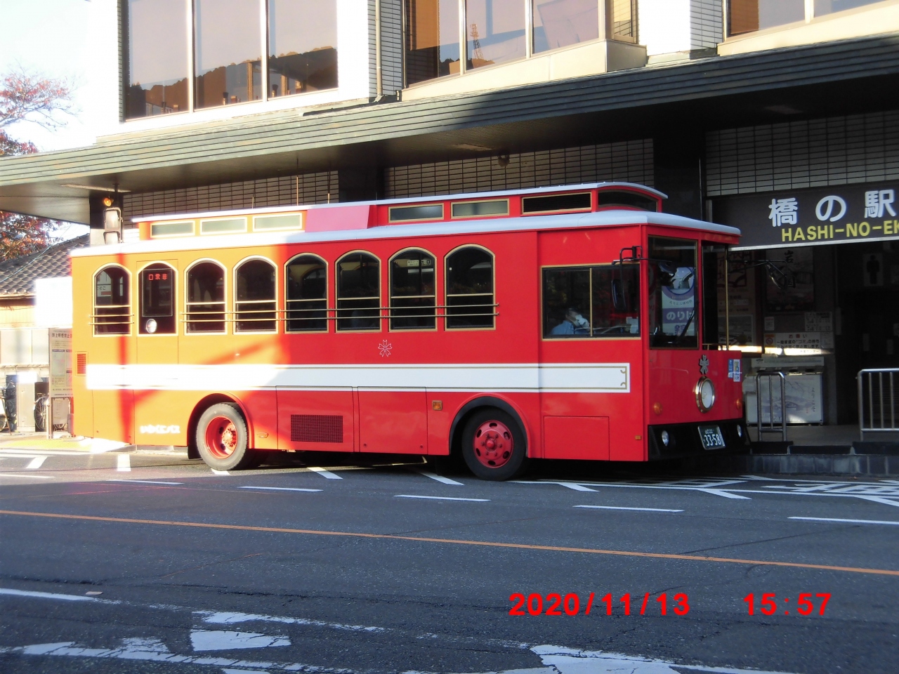 岩国市錦帯橋観光で見つけました。日本のエジソンと言われ、日本で初めて電球を作った偉人で、日本初の電車を設計したことでも知られる岩国市出身の藤岡市助博士の像が柏原美術館(旧岩国美術館)の前にあります。博士の偉業にちなみ、平成11年4月より、JR岩国駅~錦帯橋間を電車型バスいちすけ号が運行、明治42年~昭和4年まで市内を走っていた路面電車をモデルに製作された電車型レトロバスです。赤い可愛いおもちゃのような電車型バスです。
