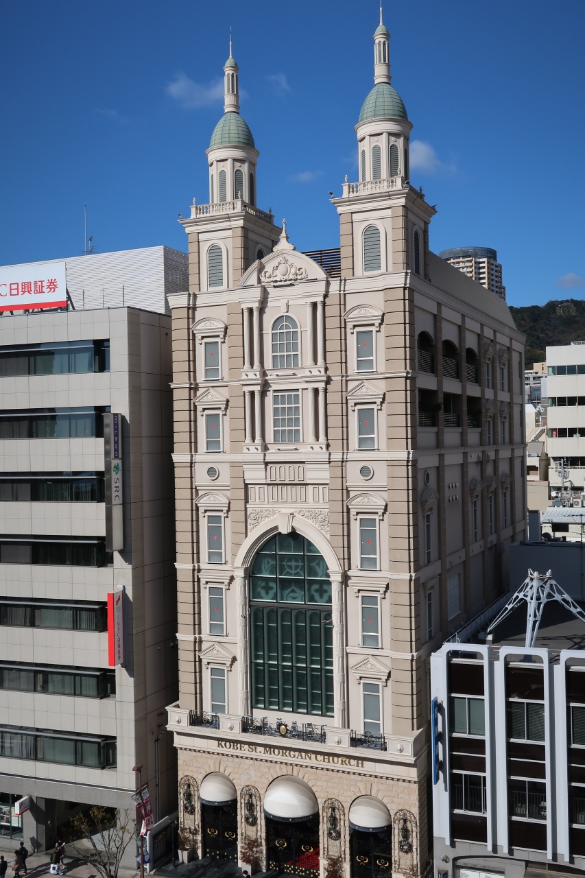 ホテル ケーニヒスクローネ神戸の部屋のバルコニーから、こちらの教会の建物がきれいに見えました。前を通りかかると、教会前でウェディング姿のカップルが結婚写真を撮影していました。結婚式場専門の教会のようでした。よってチャペルは2階にあり、建物中央の大きなアーチ型の窓がステンドグラスになっているそうです。ミュンヘンの工房で19世紀に作られた貴重なもので、こちらの結婚式場のセールスポイントになっている美しいステンドグラスですが、関係者以外は見ることができないようで残念です。