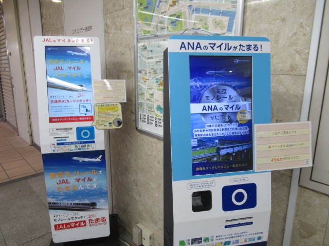 羽田空港への往復は京急を利用するのですが今回初めて帰りは「東京モノレール」に乗車しました。その感想です。利用者は京急より少ないように思えゆったりの乗車で品川からより浜松町からの乗車が少ないのでしょうね。運賃は少々お高いようですが座席は多く大きな荷物置場は便利で解放感があります。京急の羽田空港駅は第1と第2ターミナルは同じ駅で改札口違いですが、モノレールは駅自体が異なりますので注意してくださいね。それと乗車するとマイルが貯まるには驚きです。浜松駅で下車し改札口を出たところにJALとANAの加算機械がありました。スイカをかざしてマイルカードをかざすと20マイルが加算されるようで加算までは1~2カ月かかりますが楽しみです。得した感じでになりますよ。