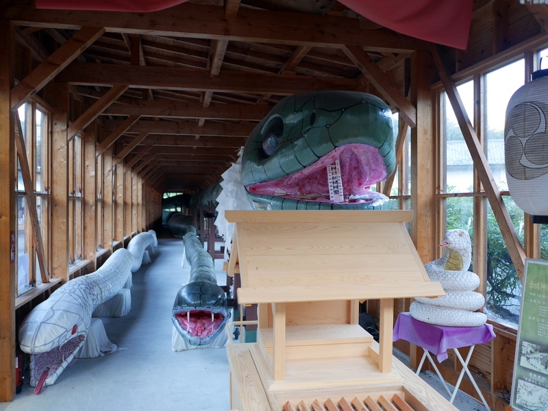 老神温泉で毎朝開催される老神温泉朝市、特に観光施設がない同地では訪れる湯治客も多い。その老神朝市会場で、大蛇祭りで使う大蛇の御輿の展示に出会った。赤城山の神(蛇)は日光男体山の神(ムカデ)と戦い、その傷を癒やしたのが老神(追い神)温泉。