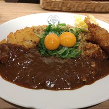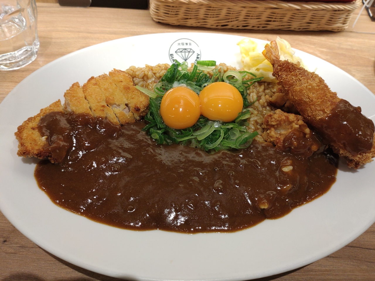 人気店の出店とのことだが、夕方5時過ぎだったので、お客さんは自分一人で待つことなく入店。欧州カレーとまぜカレーで迷いましたが、まぜカレーが気になってこちらをオーダー。また、生卵がダブルになってしまうが、全部のせのトッピングも一緒にオーダー。カレールーはじっくり煮込んでおり、長ネギがアクセント。まぜカレーは、このルーとライスとスープを軽く煮込んだもので、スパイシーなドライカレー、あとから辛さがやってくるタイプ。要は自由軒のカレーにルーがかかっているイメージ。トッピングは、唐揚げはもう少しジューシーさがほしいが、エビフライは身が思ったよりもプリプリで、カツはちょうどよい印象。キャベツのピクルスが良い箸休めになりました。