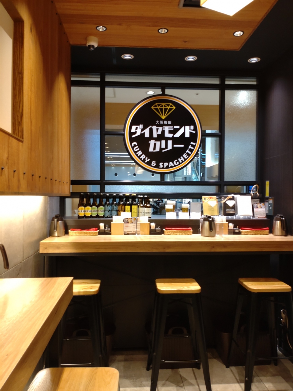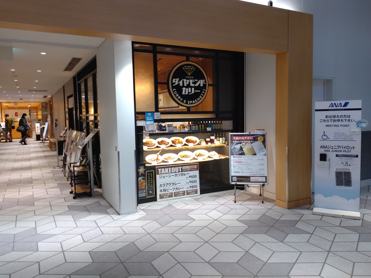大阪空港の到着口を出た左側、中央ブロック2階にあるカレー店。大阪空港の全面改装を受け、先行開業した中央エリアに出たところにあります。かつて梅田で名をはせた旧大阪富国生命ビルの「地下街カレー」のルーツを受け継いだ欧州カレーで、大阪駅前第3ビルのお店に次ぐ2号店。メニューは、カレーライスに加えて、まぜカレー、カレースパゲッティで、カツ、エビフライ、唐揚げなどのトッピングの選択が可能。ちなみに「ダイヤモンド」は、一号店の大阪駅前第3ビルにあるお店が、四つ橋筋・御堂筋・曽根崎通に囲まれた五角形の区画がダイヤモンドに似ていることと、地価が大阪一高いことから呼ばれる通称「ダイヤモンド地区」に由来。