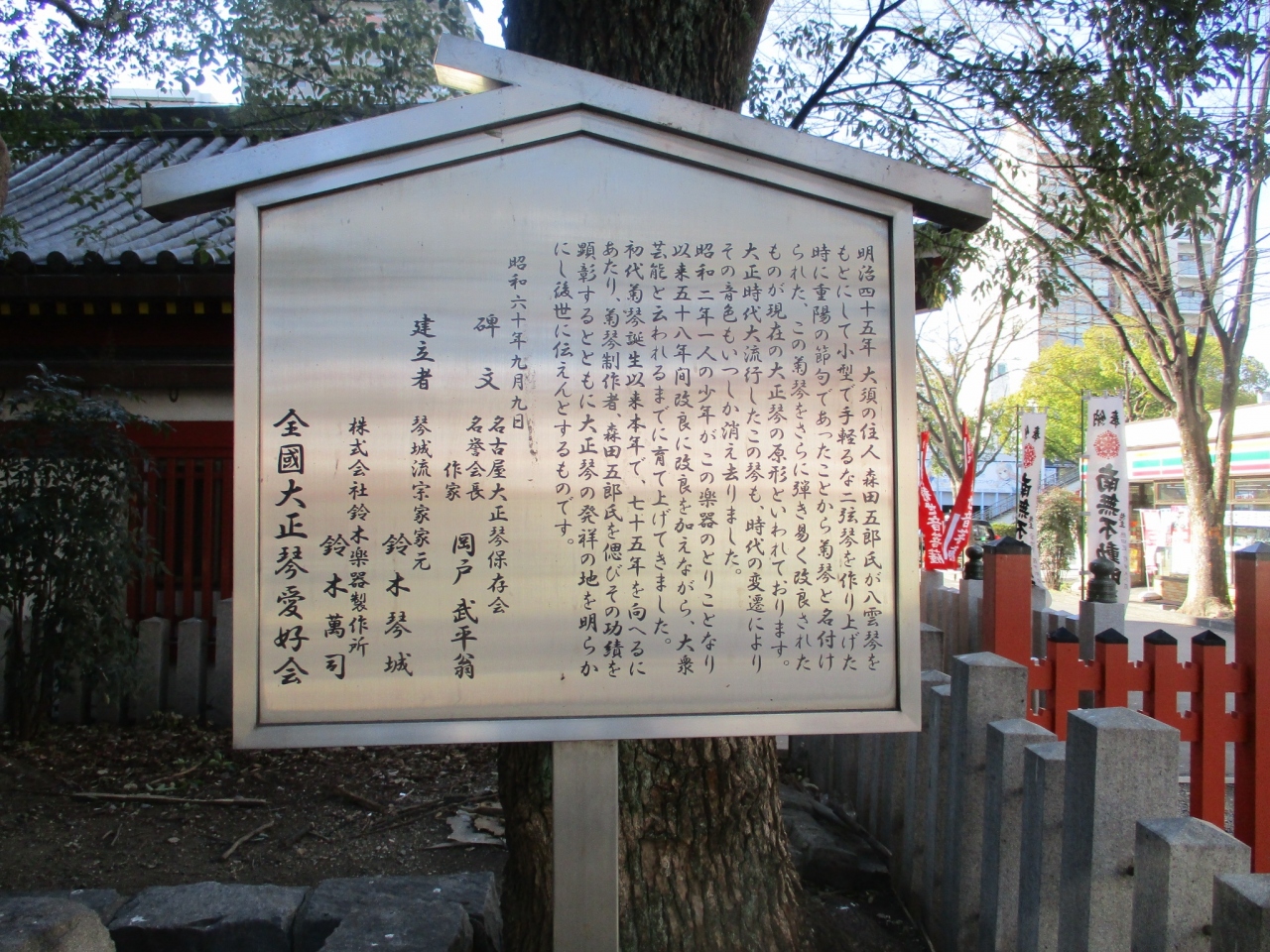 大須観音の境内を入ってすぐのところに、石碑があります。大きな自然石で「郷土芸能 大正琴発祥の地」と記されています。大正琴は、大正時代に造られた楽器だから大正琴という名前なんだなといまさらながら思いました。大須生まれの 川口仁三郎という方による発案だそうです。大正琴は気軽に始められそうな楽器のイメージがあります。