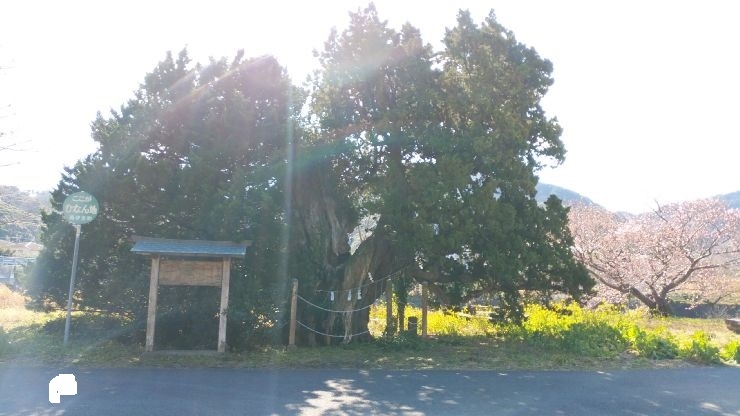 道路をはさんで山側に鳥居と社殿、川側にご神木のビャクシンがある。ビャクシン樹齢1200年と伝わり、創建の時からあったようだ。