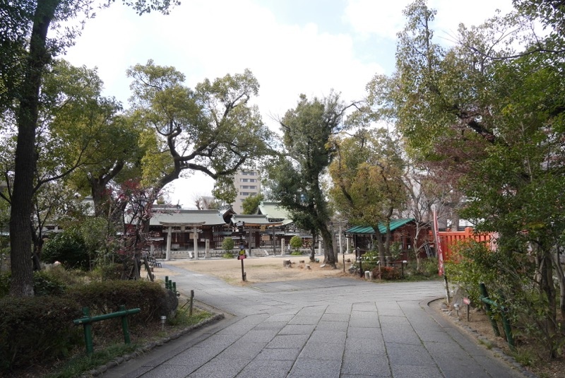通称(愛称)いくたまさん。大阪でいちばん歴史のある神社です。なにげに、神社入り口の手前にある交番の建物がかわいかったです。入ってすぐにドーン!と拝殿があり、その脇には数々の摂社末社が庭のなかに配置されています。網がかかっていてあまりよく見えませんでしたが、いわゆる弁天社の鯉がめちゃくちゃいい鯉ばかりでした。