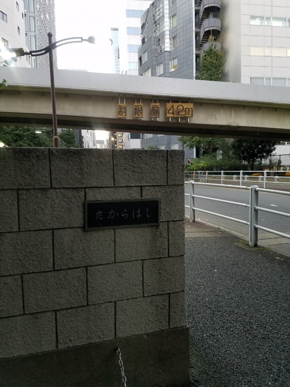 久安橋から一つ南側の橋です。久安橋では首都高速都心環状線を跨いでいたのにこっちは上空に道路があるじゃんと思ったら上空にあるのは東京高速道路への接続路ですね。宝橋の横手にある楓川宝橋公園から覗いてみると眼下にちゃんと首都高速都心環状線が走っていました。兜町界隈を歩いていてかつて楓川という川があったことを知りましたがここというか首都高速都心環状線が楓川を埋めた跡地にできたのですね。宝橋自体はとても地味ですが地理と歴史の勉強になって有意義な訪問でした。