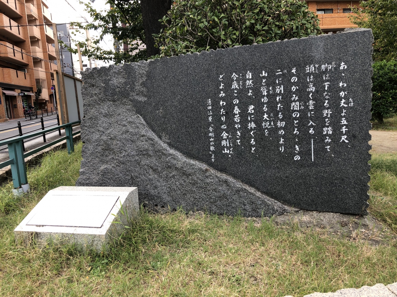 近鉄上本町駅から上町筋を北へ行った東平北公園という住宅街の児童公園内に碑があります。岡山県生まれの詩人・随筆家である薄田泣菫の「金剛山の歌」という、金色に輝く葛城山嶺に感動して歌った詩が彫られています。正直、あまり知りませんでしたが、これを機にもう少し調べてみたくなりました。