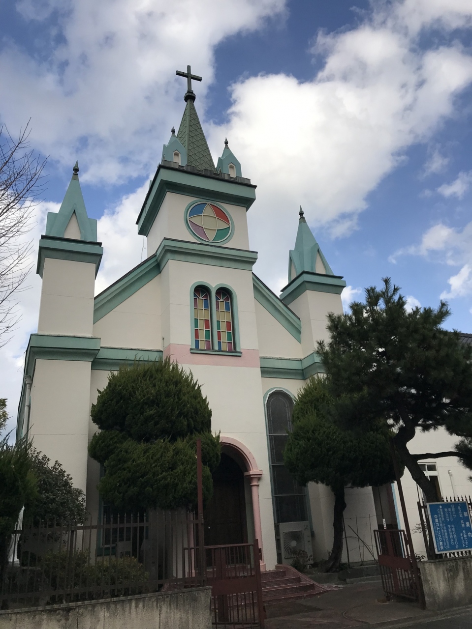 中津城大手門跡の並びに建つ教会。中津の城下町の風情が残る町並みには一際目立ち、違和感感じることなく城下町に溶け込んだ一つの風景となっている。