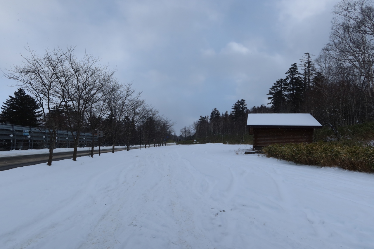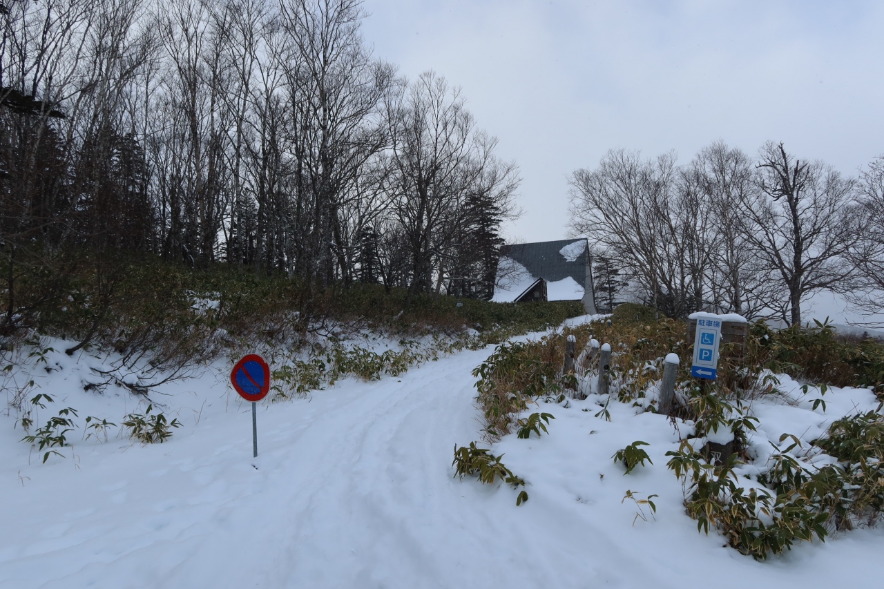 大きな駐車場があるのですが、除雪されておらずクルマが乗り上げるほどではありませんでしたが、積雪状態でした。 展望台(所)への短い坂道も完全積雪状態で長靴をはいた人なら、まぁなんとか登れるかも!ぐらいな感じ。