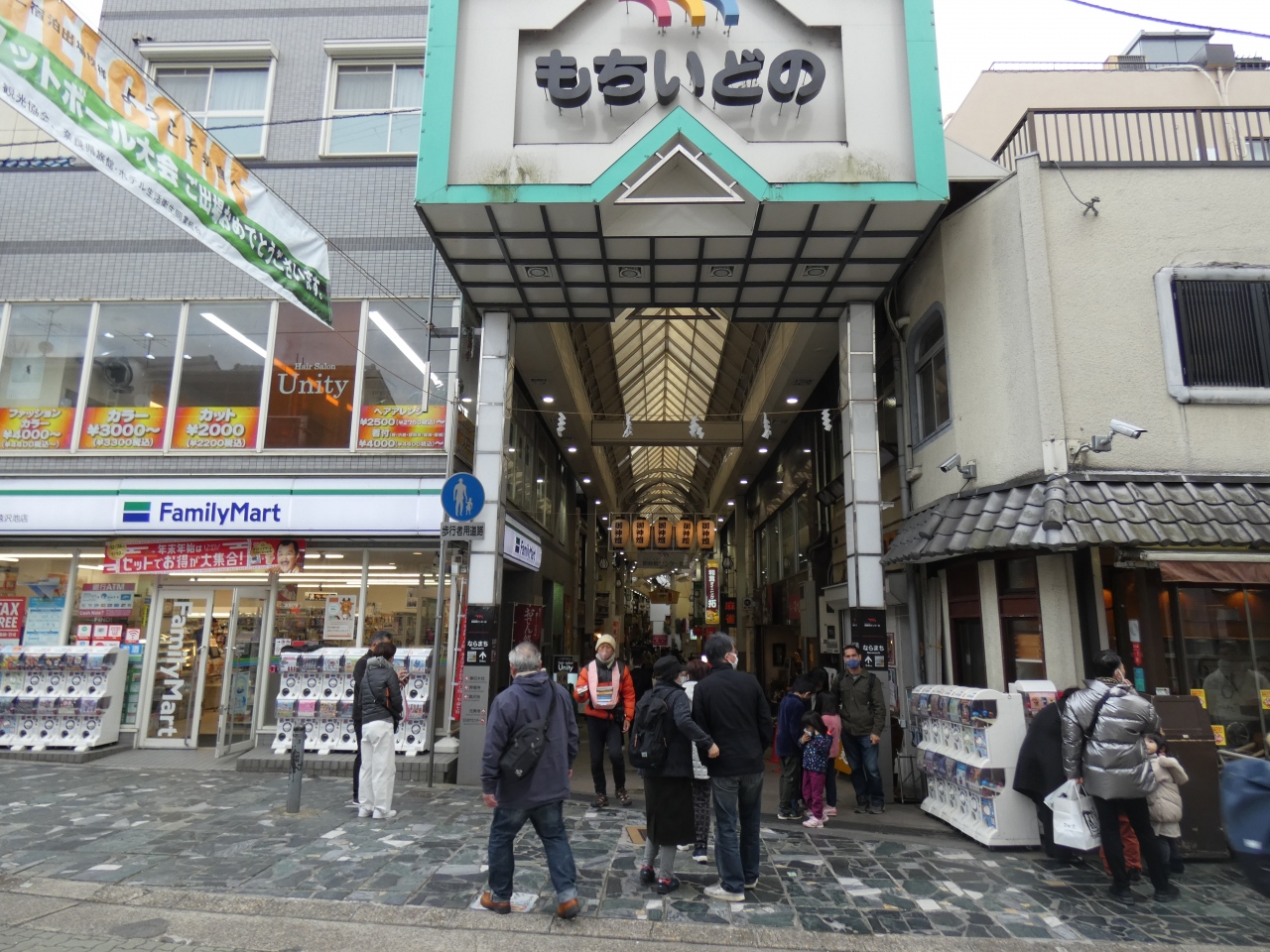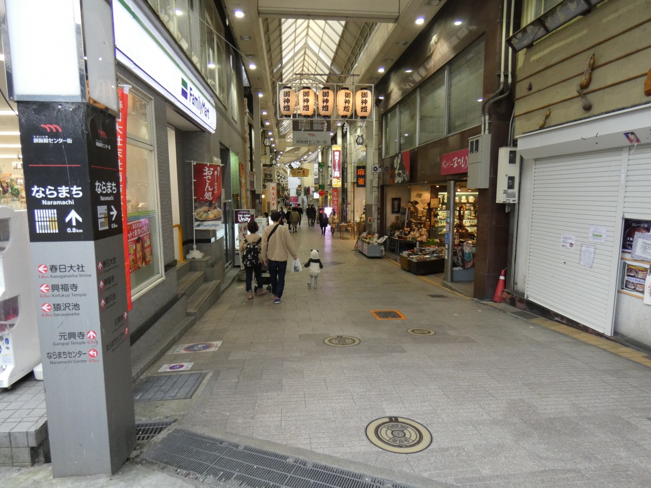 春日参道奈良三条通りの東向き商店街に東側にあるアーケード商店街。人気のならまちに繋がる通りで、東向き商店街より狭いです。餅飯殿と書いて「もちいど」と言うそうです。古から続く町並みで、ならまちの人気復活で観光客も増えているようです。