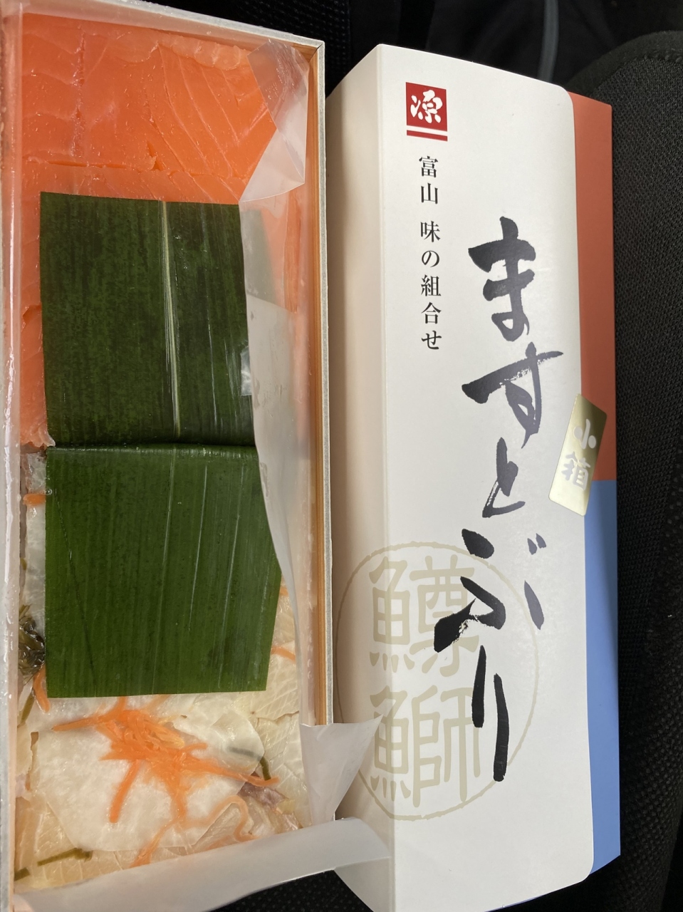 あの富山の名物の駅弁です。前に妻と旅行中に駅で買って新幹線で食べて新鮮さに感動して以来5年ぶりの現地のますのすし。今回は鰤との合わせ技です。仕事の関係で時間がなく社用車の後部座席で食べましたが笑、雪景色を見ながら堪能しました。