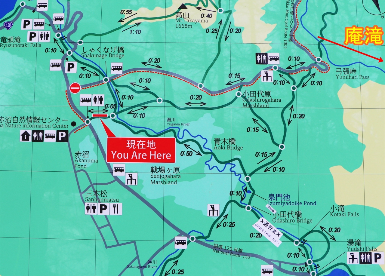 庵滝へのアクセスは戦場ヶ原の赤沼茶屋からが一番近く、往復2時間弱のトレッキング。
