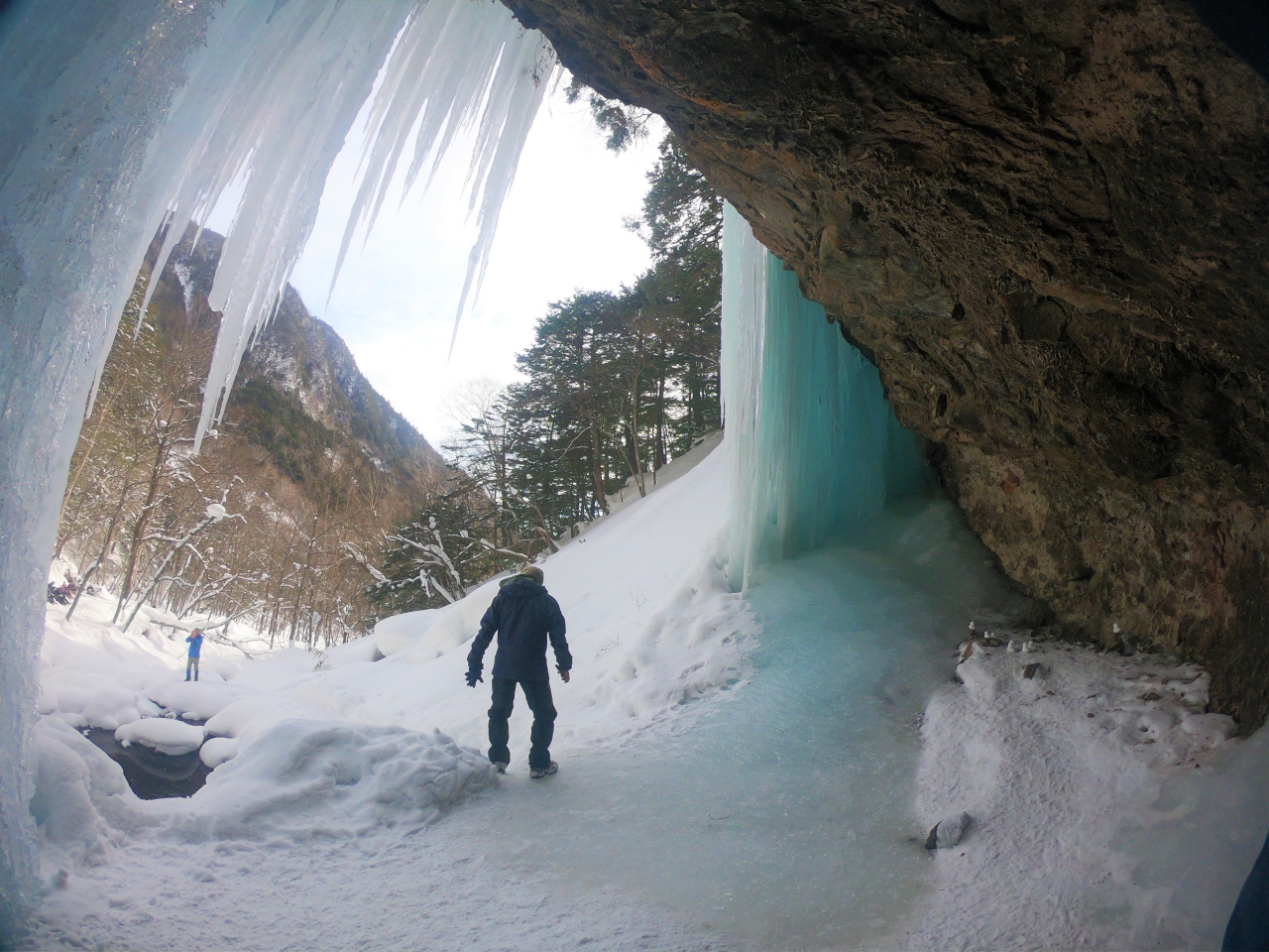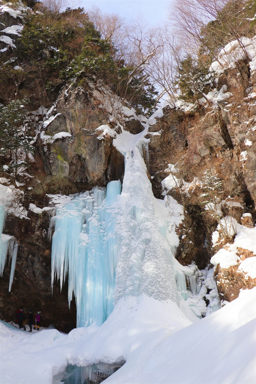 氷瀑となった庵滝へはスノートレッキング・ツアーもあるようですが、山歩きにある程度慣れている方で、赤沼茶屋まで車でアクセスできるならば、個人でも安全に歩けるルートだと思います。