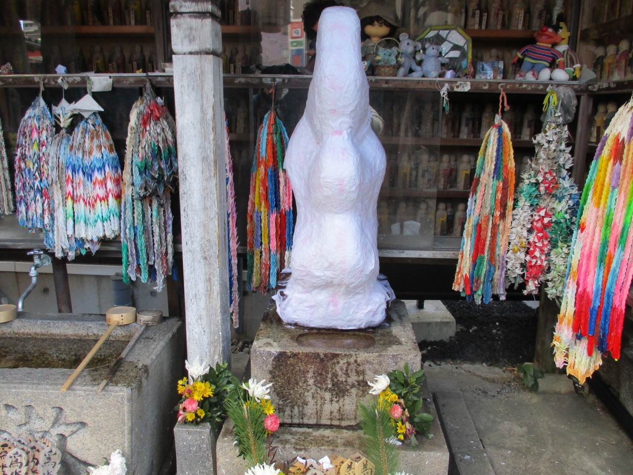 大須2丁目にある曹洞宗寺院です。本尊は十一面観世音菩薩です。山門をくぐって左側に真白な紙に全身を覆われた仏様?がいるのを見てびっくりしました。こちらは「紙貼り地蔵さん」で、自分の体の悪いところに紙を貼り水をかけると痛みや病を治すご利益があるそうです。新しい紙はすぐ横で2枚10円で売られています。お地蔵様の後ろには人形がたくさん並んでいました。