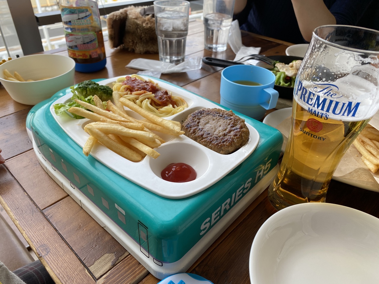 田端にある鉄道ビューの行きつけのレストランです。子供はスパゲティ好きなのと、節約のためにパスタ大盛りをおすそ分けしていましたが、この日は息子はやる気満々だったので、お子様ランチを初注文。普段あまり食べないハンバーグをもりもり食べていました!