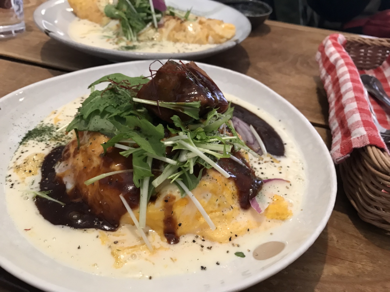 そんなくじら食堂での私達のオーダーは、定番のふわとろ卵のオムライス1つと、オムソース×デミソースの二種のソースに更にゴロゴロポークが乗せられたふわとろオムライスで、待つこと20分。