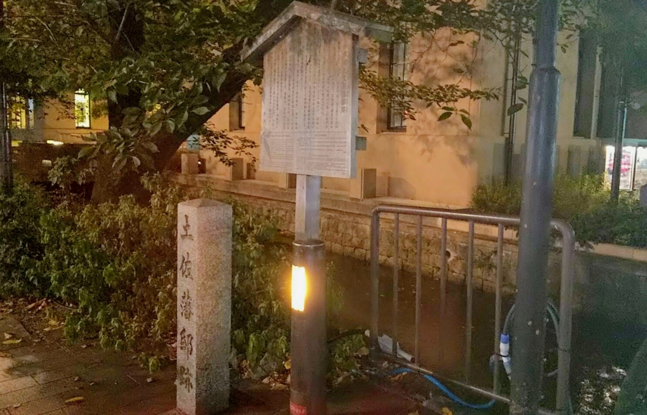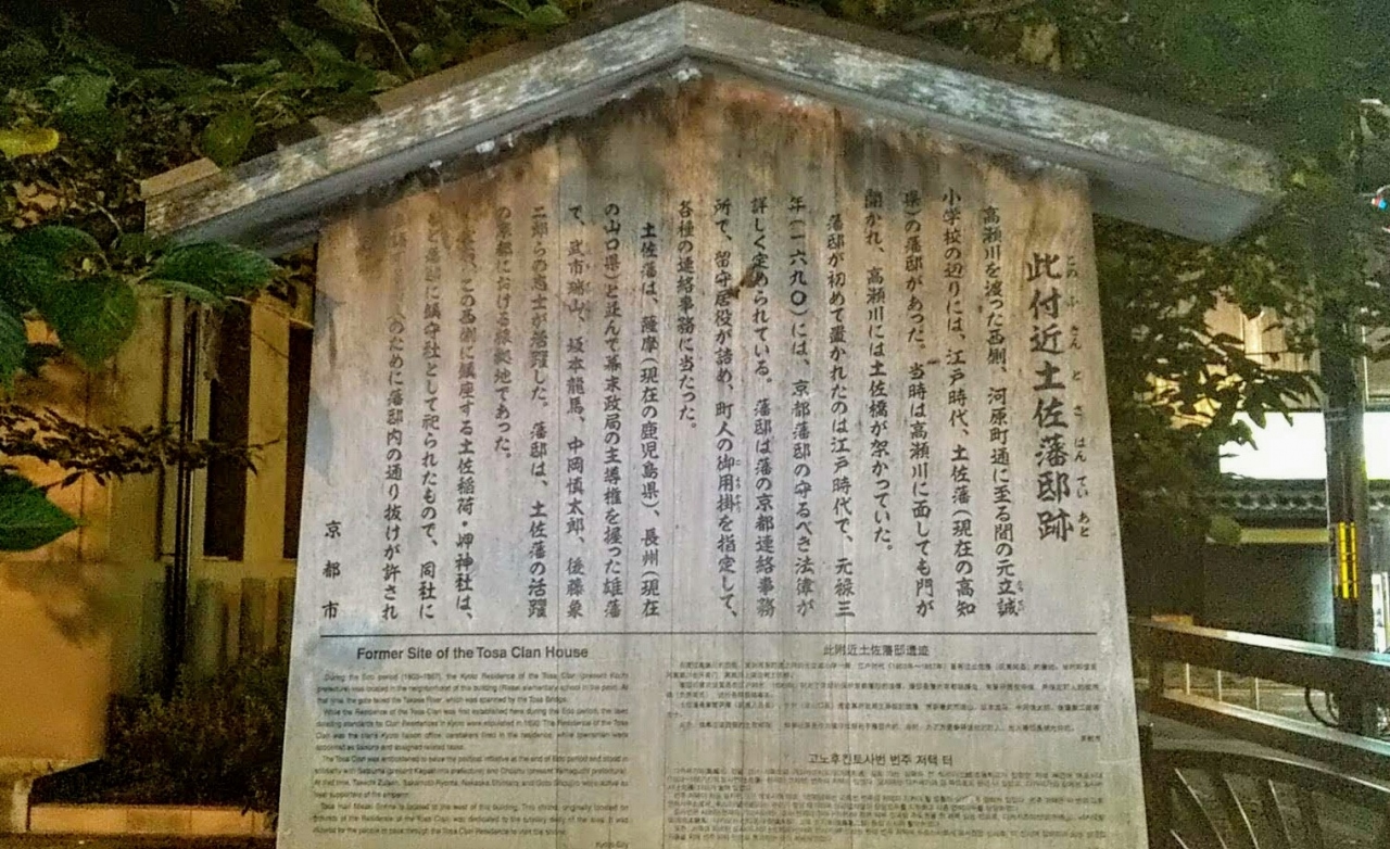 木屋町通りの史跡巡りをしていると、「立誠ガーデンヒューリック京都」前の高瀬川のほとりに『土佐藩邸跡』の石碑と駒札がありました。