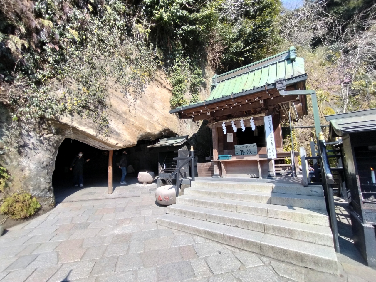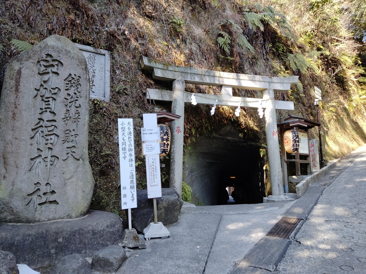 頼朝の夢枕に現れた宇賀福神のお告げによって創建されたとされる神社で、参拝するには薄暗いトンネルを抜けて境内に入り、洞窟内に湧き出る霊水でお金を洗うと金運上昇や商売繁盛の福が授かるとされています。