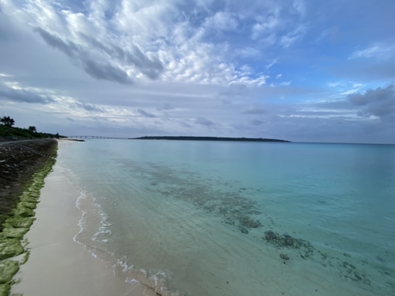 遠くには来間島、下地島、伊良部島を見ることができます。砂地なので魚はあまりいないかな!?