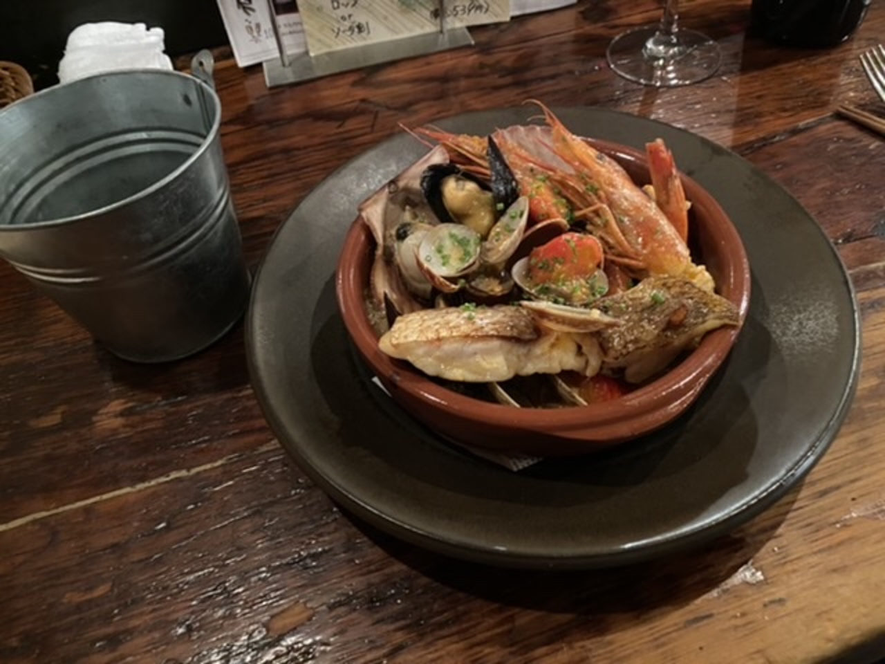 東京湾の金アジフライ、ブイヤベース、牡蠣のヴァポーレ、、、パスタはデュクセルクリームとブイヤベースのスープを使ったもののダブルで(^^)