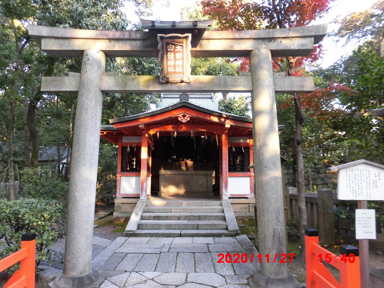 京都市八坂神社観光で立ち寄りました。太田社の御祭神は夫婦神である猿田彦神(さるたひこのかみ)と天鈿女命(あめのうずめのみこと)を祀っています。太田社の場所は、西楼門を入って正面の疫神社(摂社)の右手にある境内末社です。天鈿女命は天岩戸の前で神楽を舞った神だそうです。