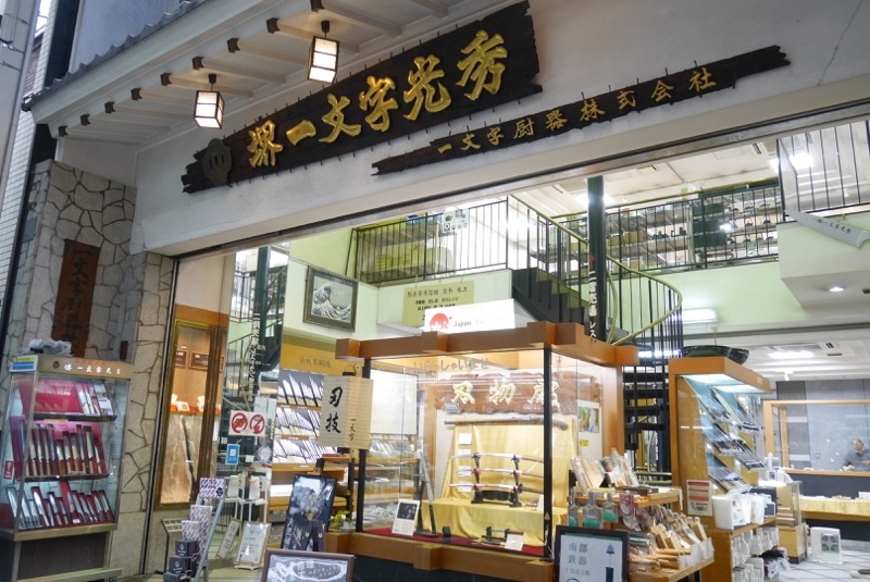 道具屋筋商店街のなかでも、かなりエンタメ色の強いお店だと感じました。そのいちばんの理由は、店頭にドーンと置かれた日本刀!刃物のお店なので、おそらく売れ筋としては包丁なのだろうと思いますが、外国人も日本人も憧れる日本刀がじっくり見てくれといわんばかりにお店の一等地に鎮座していました。