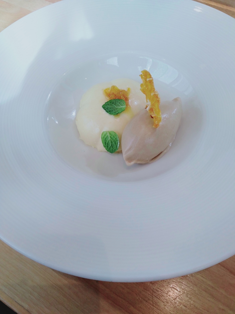 アンティパストはスペシャリテのフォアグラ・マンゴー。桜チップで燻されたフォアグラと甘いマンゴーがとても合う。