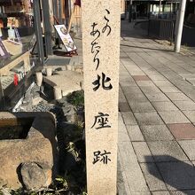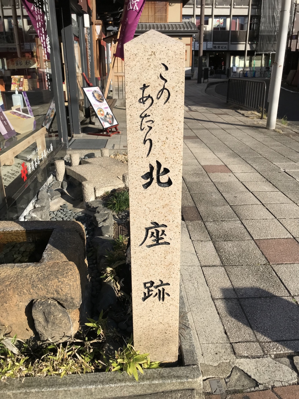 京都南座向かいの井筒八ッ橋本舗本店ビルの前に「北座跡」の碑があり、「この辺り北座跡」と書かれていました。かつて四条河原での興行が許可された7か所の常設芝居小屋の一つです。北座は明治25年に四条通拡張のため閉鎖されたそうです。気を付けていないと見過ごしてしまいそうな小さな石碑だけで、残念ながら見ごたえは感じられない場所でした。明治までは残っていたので、それを偲ぶものがあればと感慨深いものがありました。