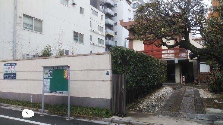 境内はコンパクトな印象。門を通ってすぐ右側に和風の建物、左側に鉄筋コンクリート造りの建物があった。本堂はおそらく左側の建物で近代的な雰囲気が感じられた。小さな空間ながら庭木が配置され、落ち着いた雰囲気が感じられた。