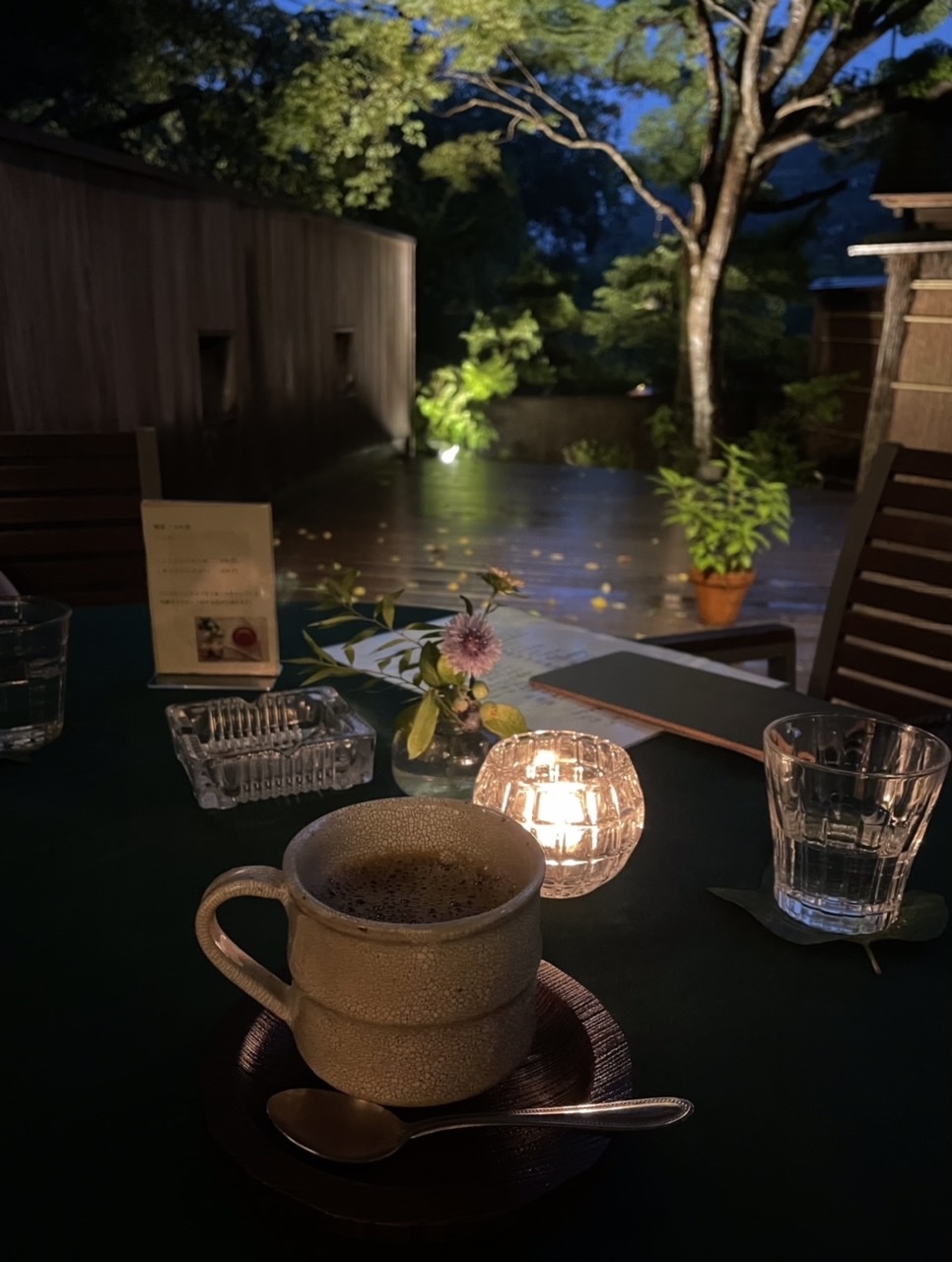 天山にはカフェもあり食後のコーヒーも楽しめます。寒くない季節はテラス席がおすすめです。
