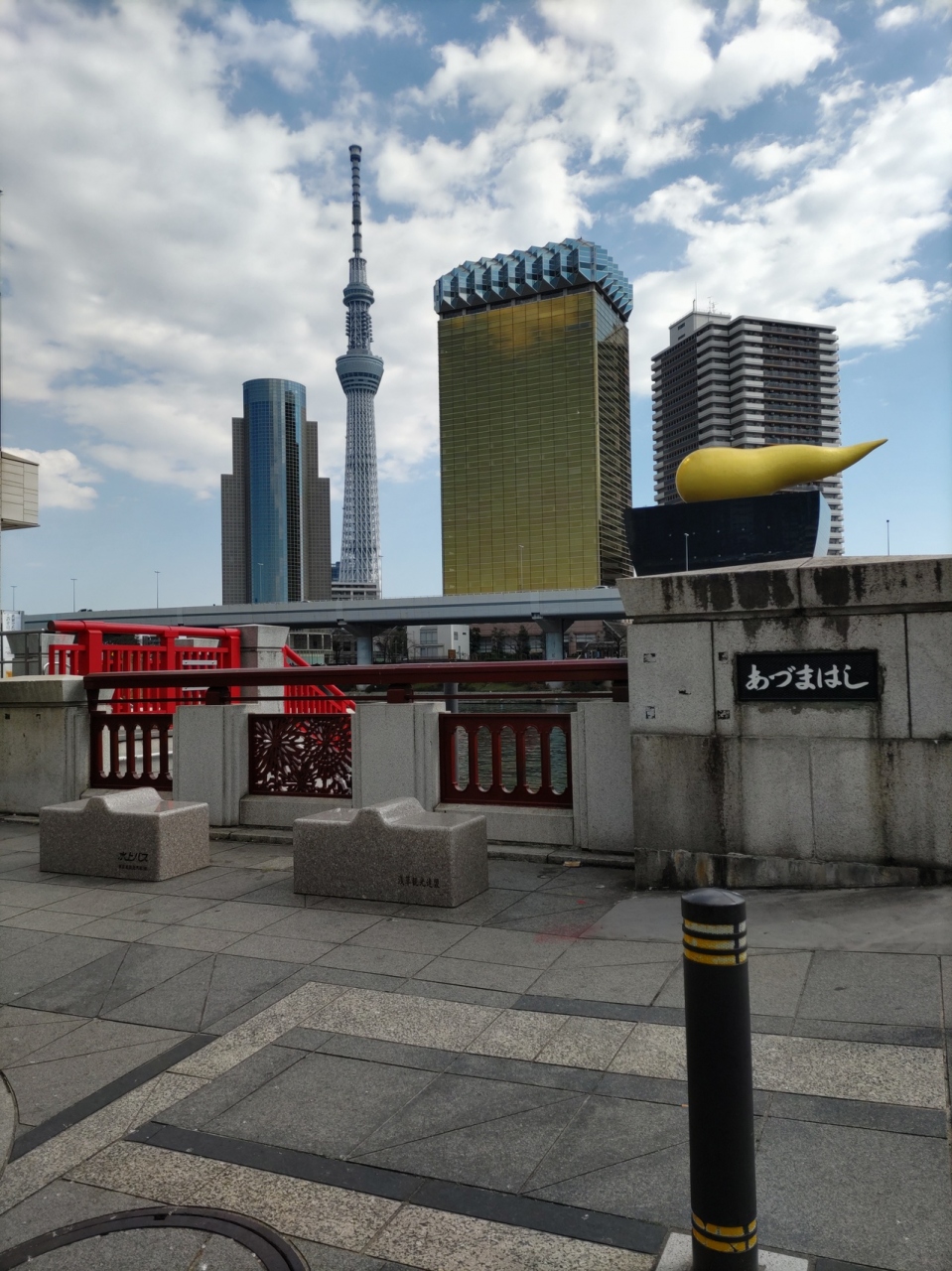 東京の観光スポット、浅草にある吾妻橋です。台東区と墨田区の間にある隅田川に架かる橋です。浅草側からの景色は特徴のあるアサヒビール本社と東京スカイツリーも見ることができ、撮影スポットとしてベストスポットです。