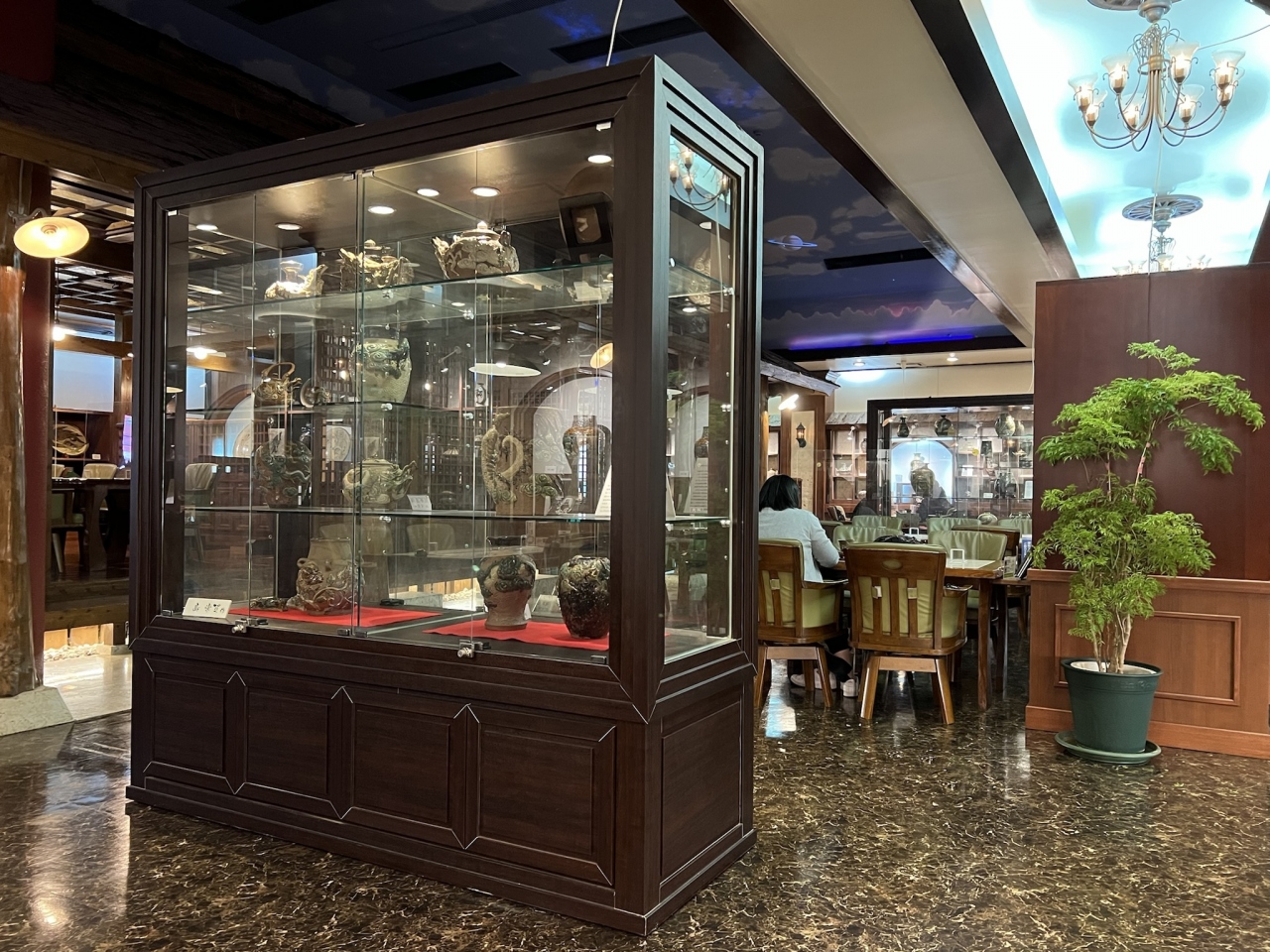 2020年の夏、御菓子御殿・国際通り松尾店の2階のレストランが、ギャラリーカフェとしてリニューアルオープン。人間国宝で、シーサー造りの名人といわれている島常賀の作品を中心に、店内には、陶芸作品がフロアいっぱいに展示されています。これらの陶芸作品に囲まれながら、ゆったりと食事やカフェが楽しめます。