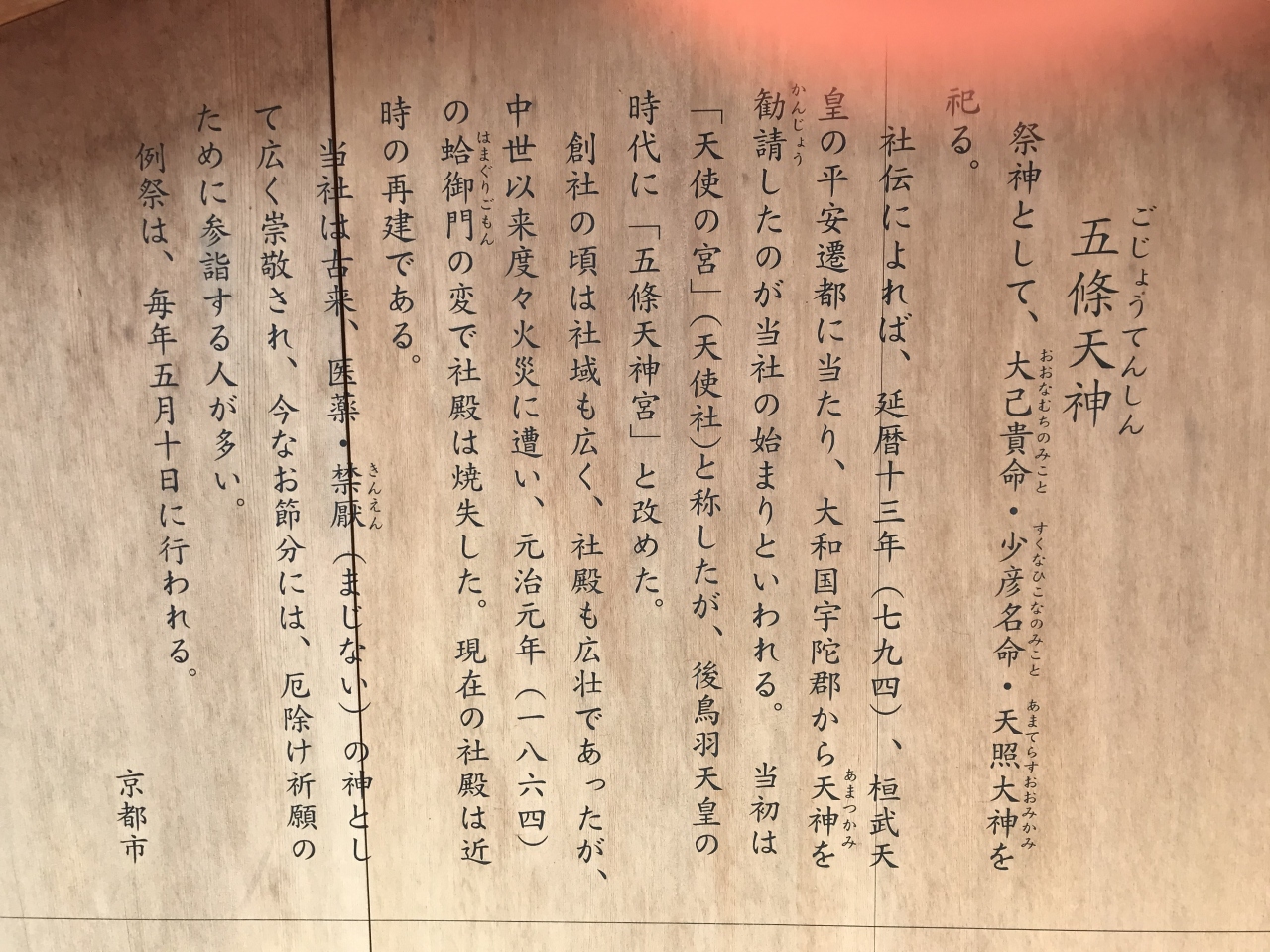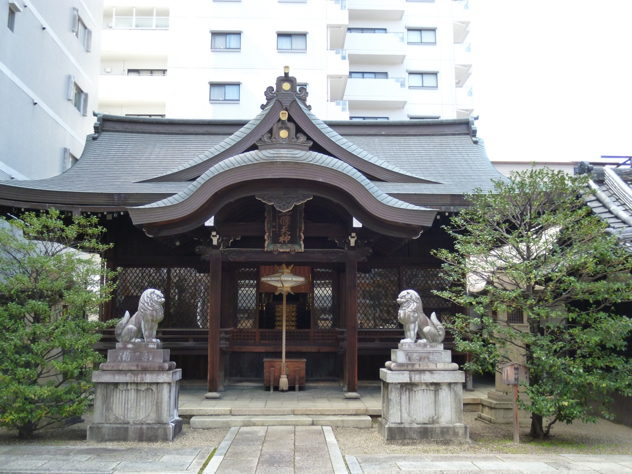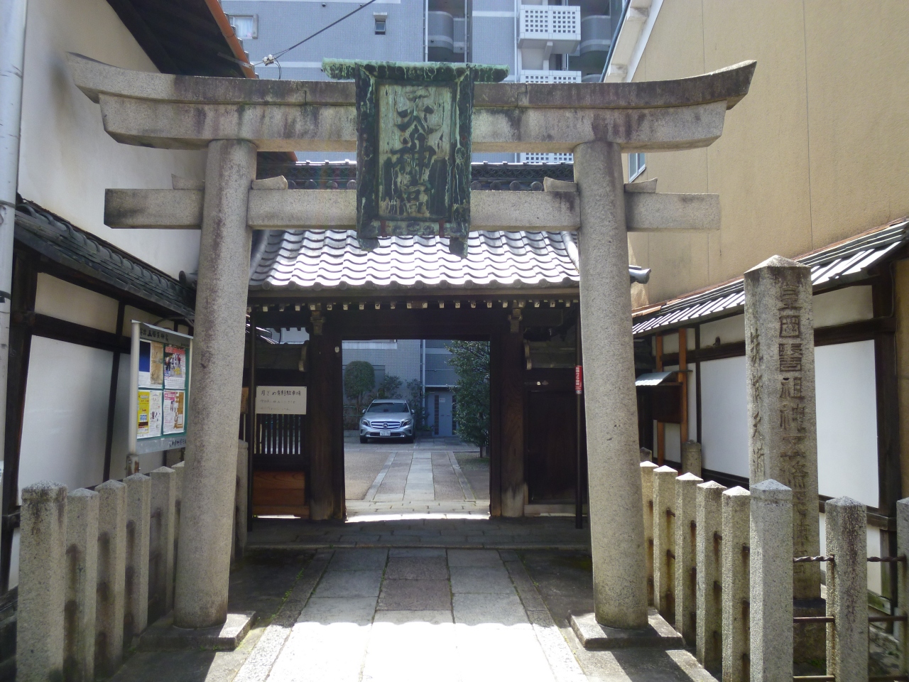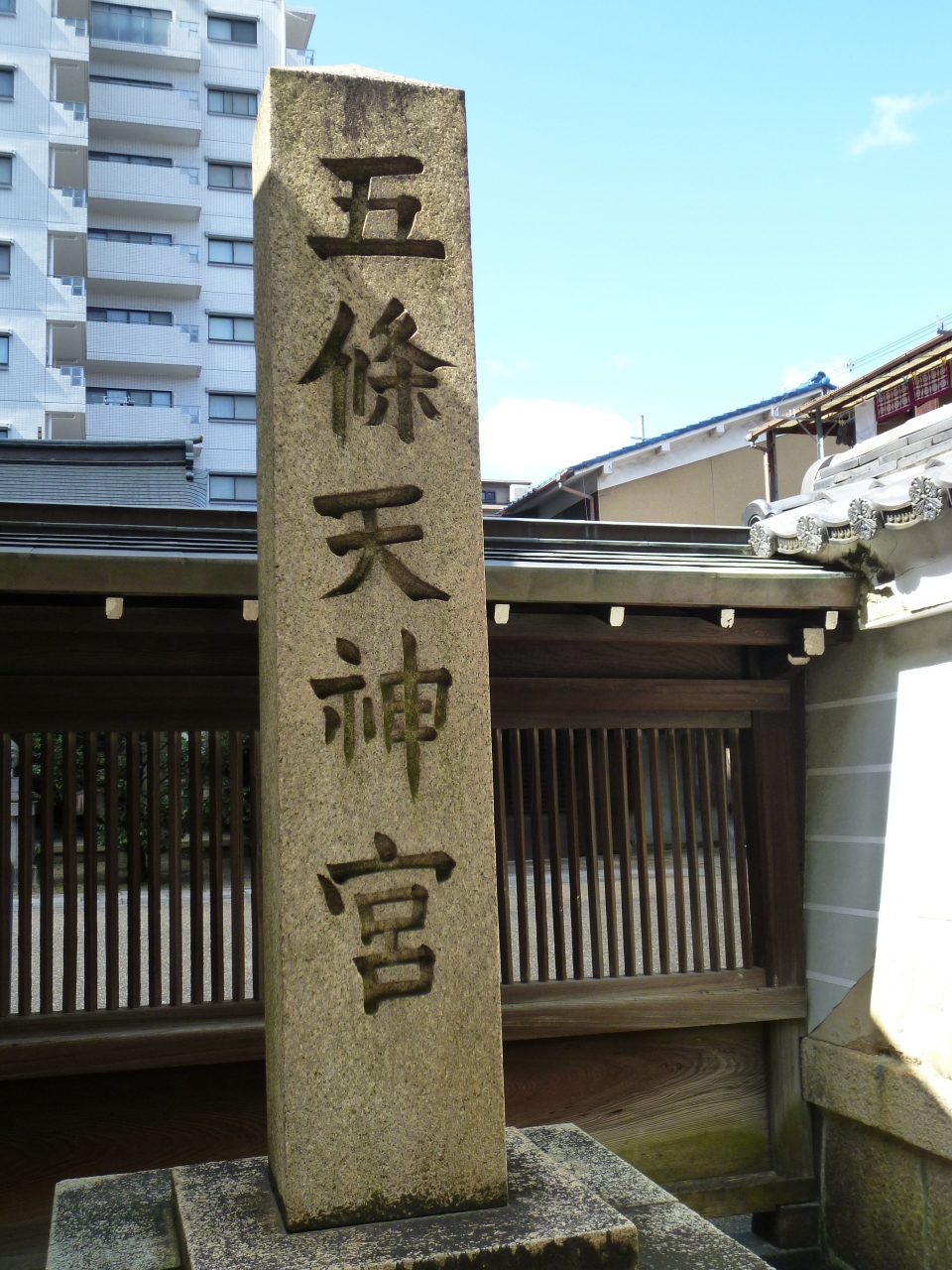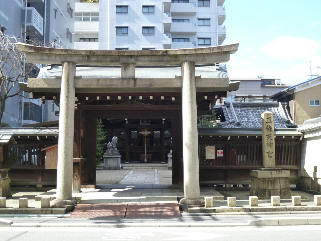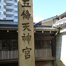 五條天神社は、地下鉄「四条」から南西へ徒歩5分くらいで、松原通りと西洞院通りの交差点南西角にあります。創建は794年、平安京遷都の折に空海が勧請したとされ、洛中最古社です。近くには菅大臣天満宮もあります。街中にありますが、比較的広めの神社で、本殿は新しくて立派な建物でした。