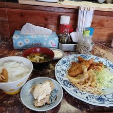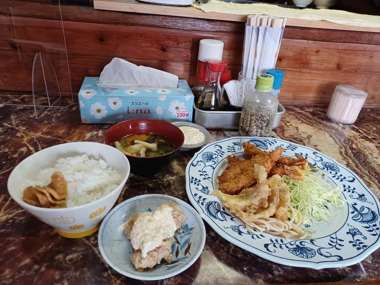 エビフライ、オニオンフライ、キャベツ千切り、パスタ、タルタルソースたっぷり、小鉢や具沢山味噌汁までついてます。凄いコスパ。