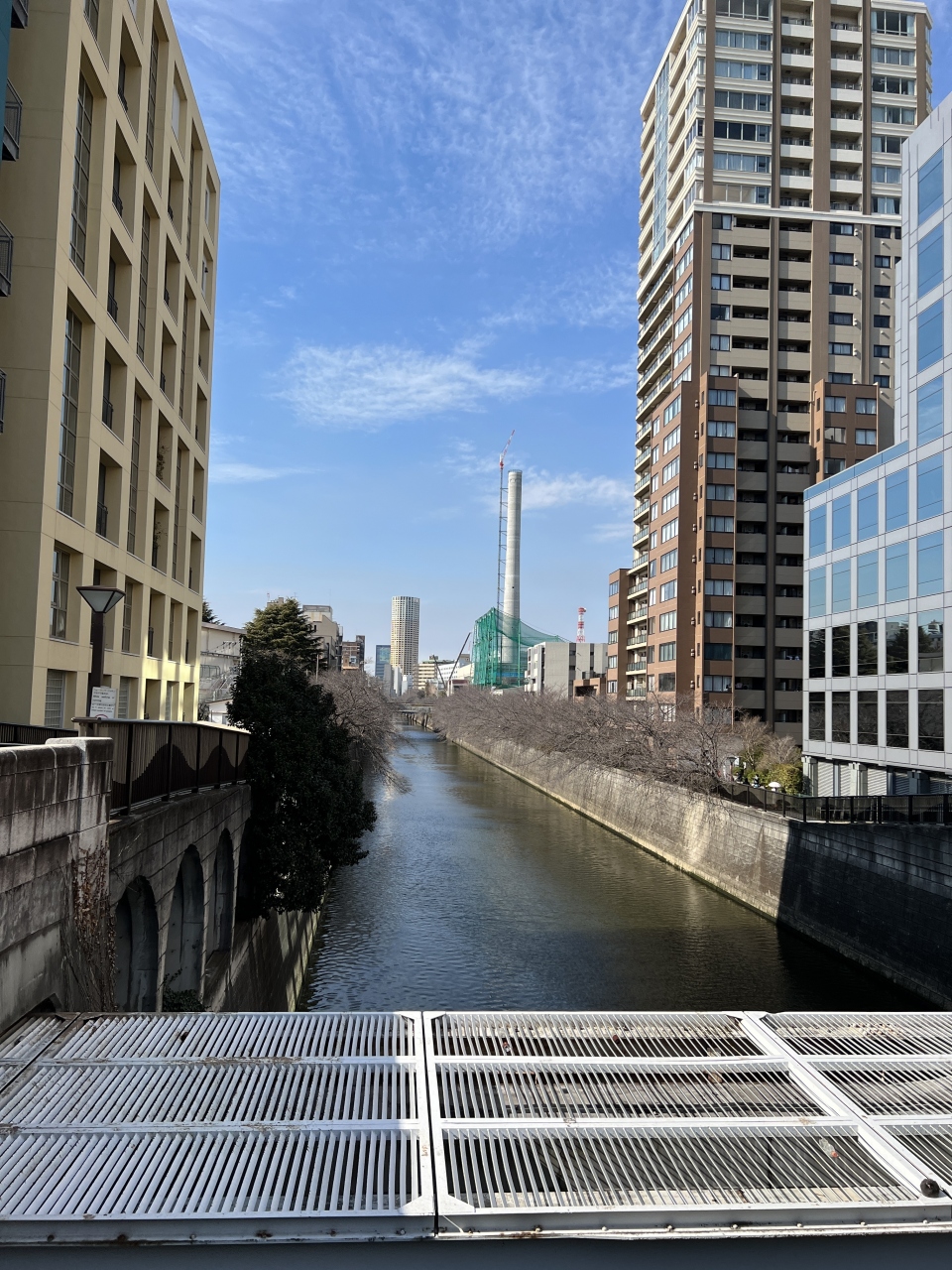 目黒駅は割と高台にあるのですが、ここ目黒川は低地にあります。桜並木は有名で毎年桜の時期になると警備員や警察も動員されて、非常に賑わいます。普段は遊歩道も含めてあまり人もいないので散歩コースにはいい場所です。