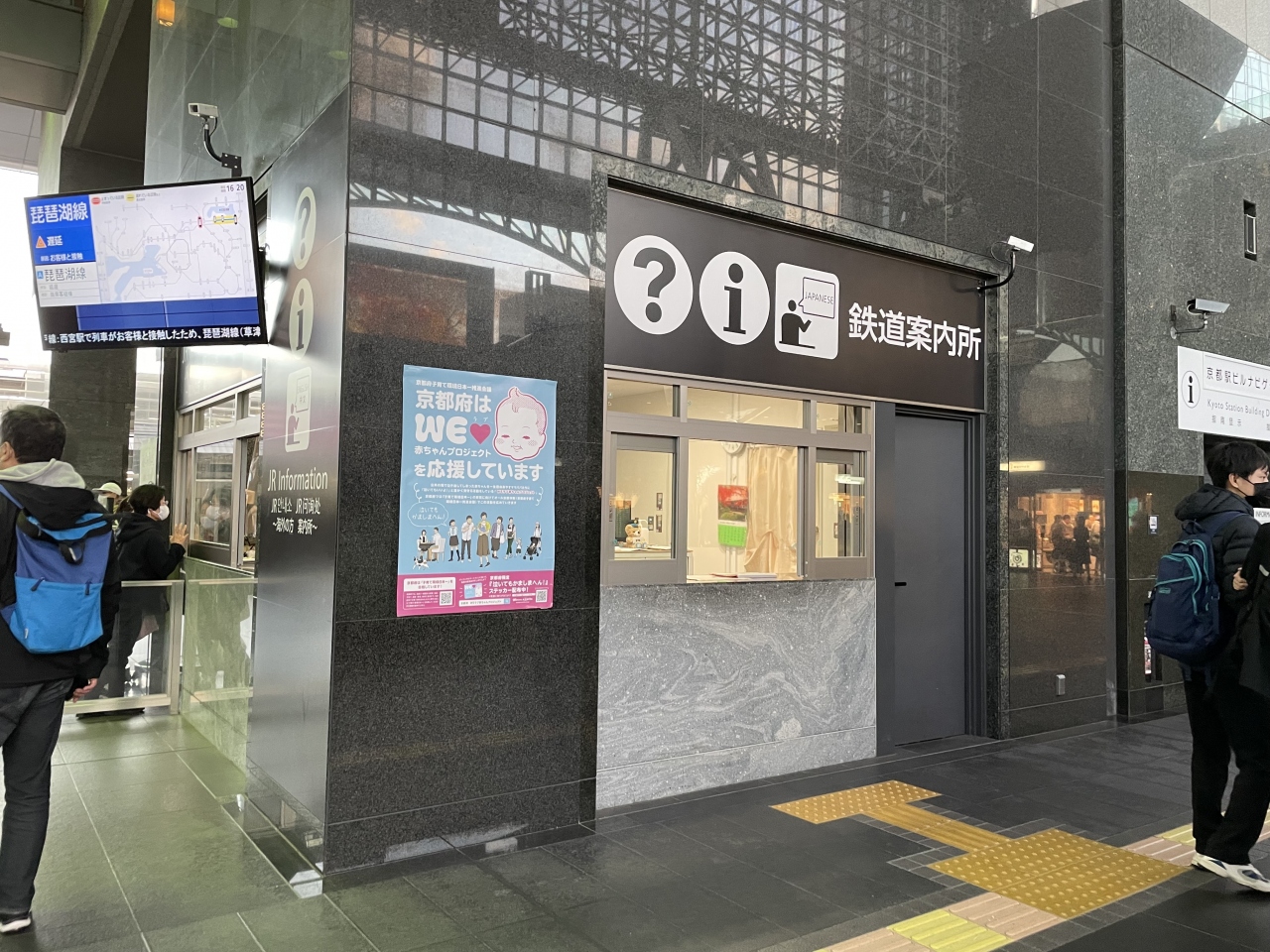 京都駅ビル内1階にある案内所です。列車の発車時刻や所要時間、効率のよい乗り継ぎやアクセス方法など、JR線全般に関する案内をしています。観光案内所ではなうので観光パンフレットが並んではおらず、一般的な観光については2階の京都総合観光案内所で行っています。