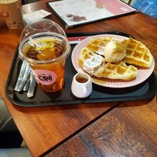ワッフルとアイスティーを注文しました。ワッフルは表面がカリッとしていてとても焼き加減が絶妙でした。アイスクリームが乗っており、あたたかいワッフルと冷たいアイスクリームのハーモニーがたまらなかったです。